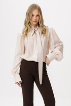 Блуза-рубашка со стояче отложным воротником и центральной застёжкой на петли и пуговицы. Перед с накладным карманом и декоративной деталью с застёжкой на пуговицу. Спинка с отрезной кокеткой и складкой от неё. Рукава втачные с манжетами по низу.
