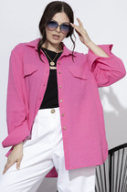 Блуза свободного кроя, укороченная, из хлопковой ткани. Воротник рубашечного типа с отрезной стойкой. По переду отрезная кокетка с отделочной тесьмой из бусин. Центральная застежка на пуговицы. Рукав спущенный на манжете с застежкой на пуговицу.