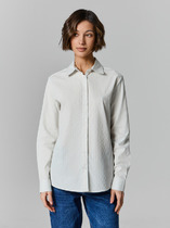 Женская рубашка свободного силуэта с притачным топом на шлейках из отделочной ткани и рубашечным воротником. По спинке настрочены три шлевки по низу топа в которые втянут шнур. Спинка с кокеткой. По переду рубашки планка на застежку. Рукав короткий, прямой, втачной, с пришивной манжетой по низу c застежкой на пуговицу. Низ изделия фигурный.