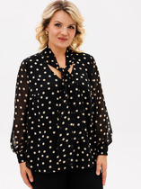 Стильная рубашка свободного кроя с ассиметричной центральной планкой на застежку петли-пуговицы. Рукав короткий. Спинка изделия с кокеткой и складкой. Низ изделия фигурный.