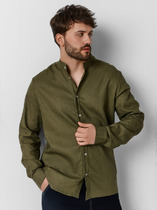 Рубашка мужская из фактурного полотна с втачными рукавами длиной до локтя, стояче-отложным воротником и центральной бортовой застежкой на петли и пуговицы. По воротнику и проймам настрочены отделочные строчки. Нижние срезы рукавов и изделия обработаны подгибкой.