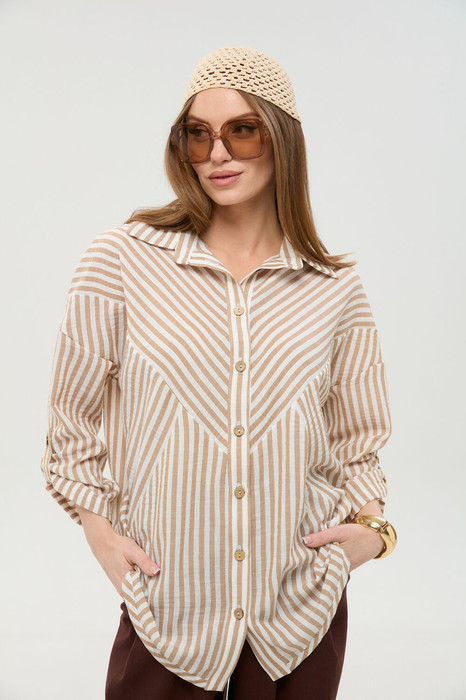 Рубашка прямого силуэта с притачной планкой с застёжкой на петли и пуговицы. Рукав втачной одношовный со спущенной линией плеча с патой. Воротник рубашечный стояче-отложной. Перед состоит из трёх частей : центральная часть ,верхняя часть и нижняя часть. Спинка состоит из двух частей . Линия низа фигурная с широкой окантовкой.