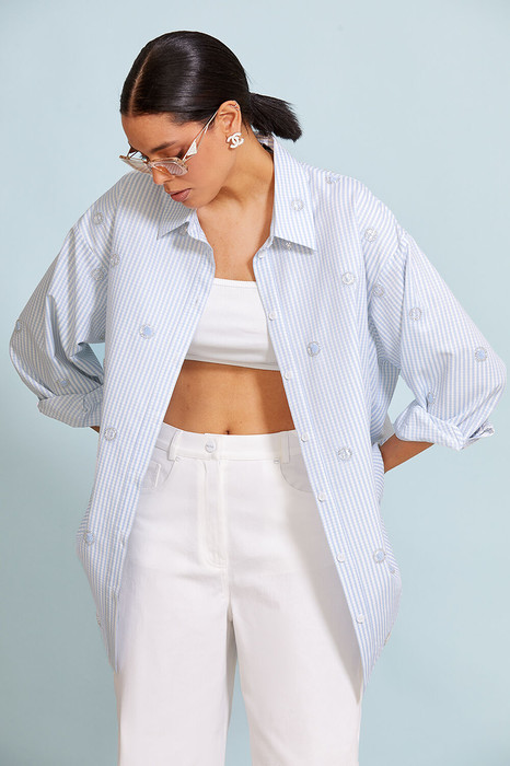 Удлиненная  рубашка  прямого силуэта  длиной   ниже середины  бедра, выполнена   из  премиального хлопка   с вышивкой.  Центральная  застежка доверху  на петли и пуговицы. Спущенная линия плеча, объемный рубашечный  рукав. Рукав  на притачной манжете. Спинка прямая. Рубашечный  воротник на стойке.