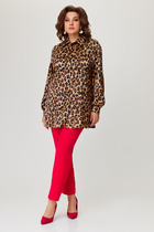 Блуза женская прямого силуэта, свободного кроя. Выполнена из блузочной ткани. Горловина оформлена воротником. Спинка и перед цельные. На переде расположена центрально-бортовая (потайная застежка) на петли и пуговицы. На стойке пришита декоративная пуговица. Низ блузы фигурный  фантазийной формы.