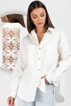 Детали: рубашка прямого силуэта, спущенная линия плеча, застежка на петли и пуговицы, длинные рукава с притачными манжетами, фигурный низ.