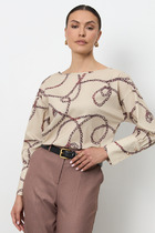 Блузка женская свободного силуэта выполнена из легкой хлопковой ткани. Горловина с отложным воротником на стойке. Застежка центральная на петли и пуговицы. Спереди в верхней части накладные карманы. Спинка с кокеткой и складкой из-под кокетки. Плечо спущенное, линия поймы углубленная. Рукава длинные на манжете, с застежкой на петлю и пуговицу. Линия низа блузки фигурная.