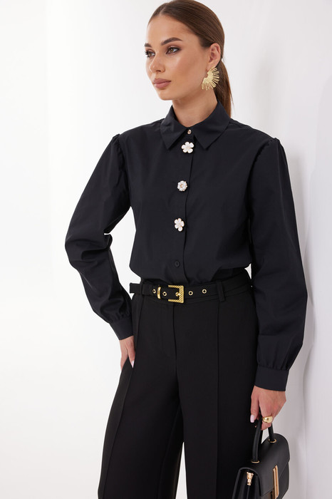 Блузка женская из рубашечной ткани, для повседневной носки, прямого силуэта с центральной застежкой на петли пуговицы. На стойке и манжетах рукава золотистые кнопки. По окату и низу рукава легкая сборка. На верхние три пуговицы пристегиваются декоративные накладки в виде цветков.