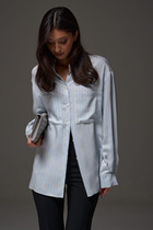 Рубашка (туника) молодежная из трикотажного полотна «флис» с эффектом «варенки», полуприлегающего силуэта, с длинными втачными рукавами на притачных манжетах, стояче-отложным воротником, нагрудным карманом, фигурным низом и центральной бортовой застежкой на петли и пуговицы. Спинка – с отрезной кокеткой и бантовой складкой в центре соединительного шва.