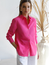 Блузка женская удлиненная прямого свободного силуэта из ткани. Блузка с цельнокроеной планкой и центральной застежкой на пуговицы.