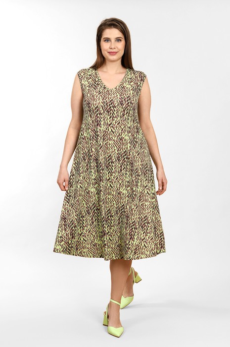 Сарафан женский из трикотажного вискозного полотна с набивным рисунком свободного покроя, расширенное книзу, с горловиной V- образной формы, окантованной основным материалом.