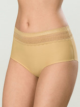 Трусики формы Brief со средней посадкой выполнены из нежного кружевного полотна. Мягкая резинка, подгиб и плоский шов  по верхнему срезу трусиков и краю ножек спереди и  ажурный край сзади .