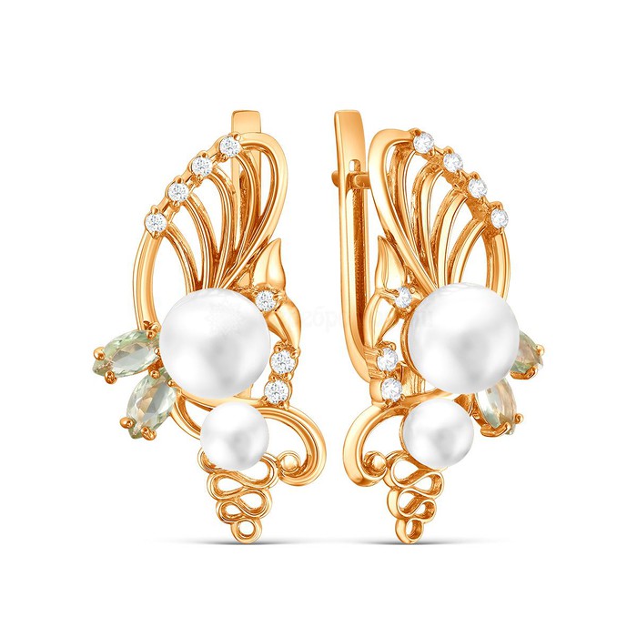 Серьги из золочёного серебра с гидротермальным кварцем цвета празиолит, жемчугом