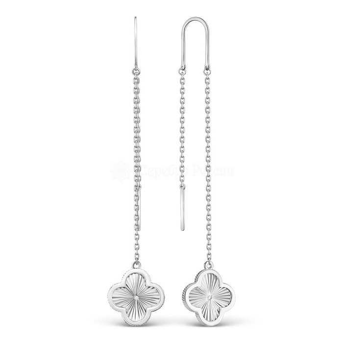 Серьги-продёвки длинные серебро в форме клевер с фианитом родированное коллекция