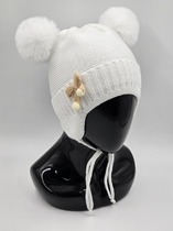 Милая шапочка-капор для малышей на холодную зиму с подворотом. Манишка застегивается на пуговку. Спереди вывязан рельефный рисунок в виде косы. Верхний слой связан из полушерстяной мериносовой пряжи. Подклад выкроен из хлопкового полотна и полностью пришит. Утеплитель изософт. На макушке два небольших помпона. Они привязаны, можно отвязать.