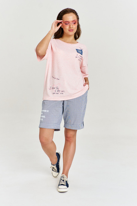 Шорты из легкой хлопковой ткани со стрейчем, длиной до колена, с четырьмя функциональными карманами с хлястиками и пуговицами. Пояс широкий, на резинке, с кулисой и шнуром. Длина шорт регулируется отложной манжетой, фиксирующейся с помощью хлястика. Изделие декорировано авторским шрифтовым принтом.