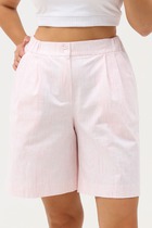 Шорты женские ,прямые, с застёжкой на тесьму-молнию и кнопку. В боковых швах обработаны карманы. Верхний срез обработан поясом с резинкой по спинке. По низу отложные манжеты. По шву притачивания пояса по переду заложены односторонние складки.