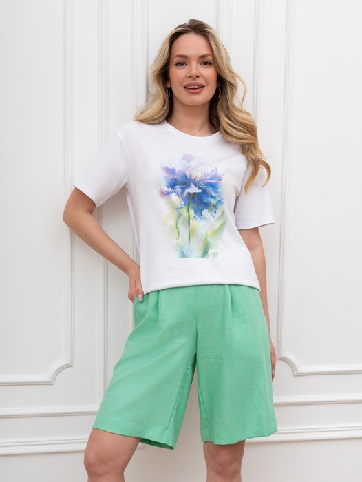Шорты – женские из гладкокрашеного тканого полотна, свободные, длиной выше колена, с карманами в боковых швах и двумя заложенными складками по талии, на притачном поясе с эластичной тесьмой внутри. Средний шов передних половин обработан имитацией «гульфика».
