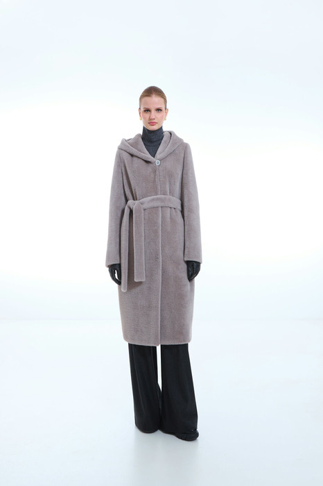 Пальто женское демисезонное, однобортное, прямого силуэта длиной ниже колена, на подкладке. Застежка на пришивные кнопки. Перед с функциональными карма-нами в рельефных швах. Рукав длинный, двухшовный. Пальто с капюшоном и съемным поясом