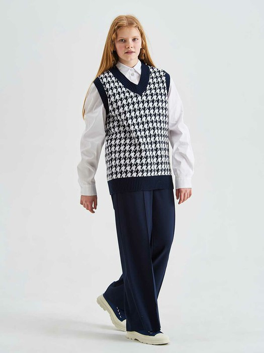 Вязаный жилет из смесового хлопка с V-образным вырезом. Ворот, пройма и низ изделия оформлены резинкой.