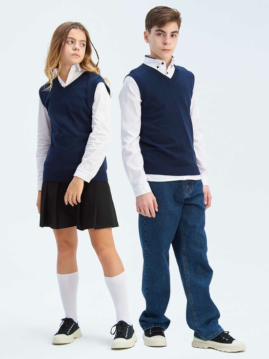Вязаный жилет из смесового хлопка с V-образным вырезом. Ворот, пройма и низ изделия оформлены резинкой.