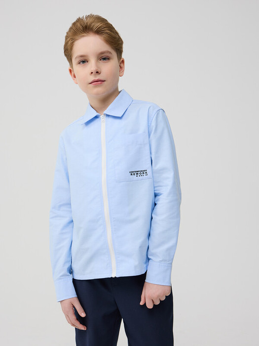 Сорочка для мальчика из смесового хлопка полуприлегающего силуэта. На спинке - кокетка. Воротник отложной со стойкой. Левая сторона полочки дополнена накладным карманом. Карман вверху декорирован принтом. Застёжка по центру переда на молнию. Рукава рубашечные со шлицами и манжетами.