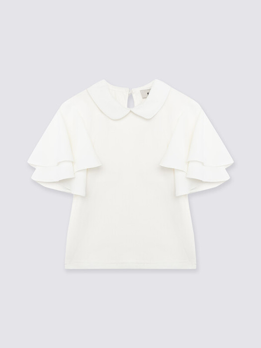 Нарядный трикотажный джемпер станет идеальным выбором для школы. Выполненный из мягкого полотна, он обеспечивает комфорт и стиль в течение всего дня. Особенность модели — вырез «капля» на спинке, оформленный застежкой, добавляет элегантности образу. Воротник состоит из двух частей с закругленными концами как спереди, так и сзади, подчеркивая аккуратность дизайна. Волан придает изделию легкость и изящность.Короткие рукава обеспечивают свободу движений и идеально подходят для теплого времени года или помещений.