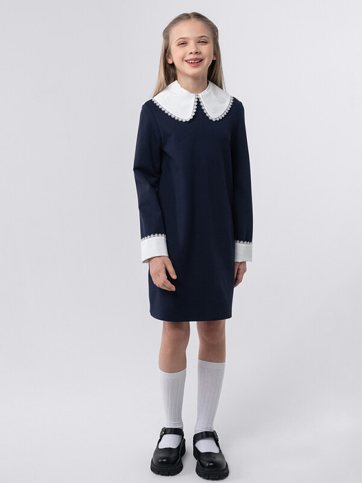Платье выполнено без подкладки из мягкого трикотажного полотна. Застежка в среднем шве спинки позволяет легко надевать и снимать изделие. Наличие карманов в боковых швах делает его не только стильным, но и практичным. Белый воротник и манжеты добавляют оригинальности и элегантности этому наряду. Воротник с закругленными углами на притачной стойке делает образ завершенным. Уделено внимание деталям: в шов обтачивания воротника вложено кружево, что придает ему нежный вид.