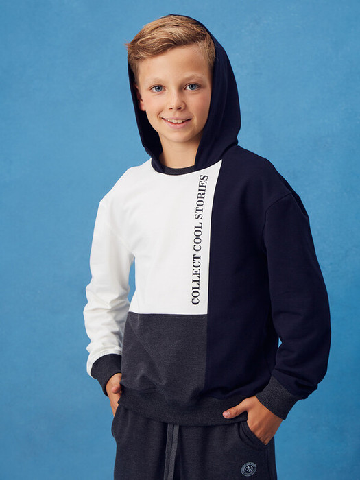 Толстовка с капюшоном станет отличным дополнением к гардеробу ребенка школьного возраста. Она выполнена из трикотажного материала и имеет свободный силуэт, что обеспечивает комфорт при носке и активных занятиях. Интересный дизайн передней части состоит из трех деталей разного цвета, что делает модель яркой и стильной. На верхней детали нанесен принт, добавляющий индивидуальности.