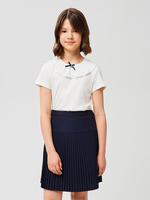 Трикотажный джемпер для девочки с короткими рукавами и объемным воротником из трикотажа гофре. Воротник по центру переда украшен бантиком из репсовой ленты с фирменным элементом ""S"". Застежка на спинке на пуговице обеспечивает комфорт в повседневной носке.