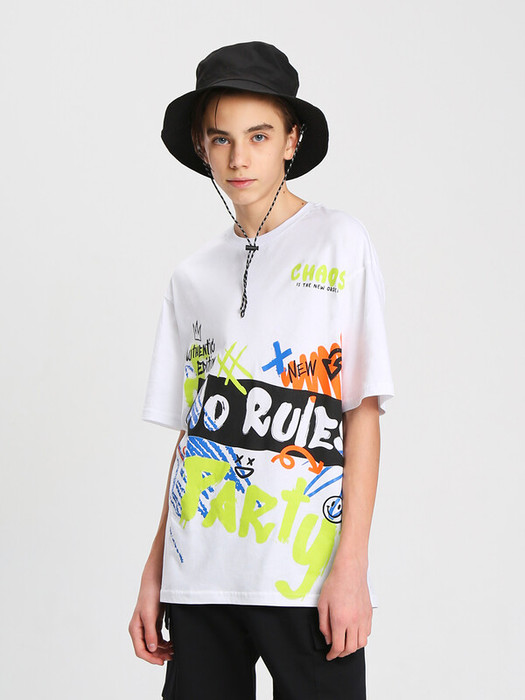 Стильная футболка для мальчика. Свободный прямой силуэт и приспущенное плечо. Модель выполнена из качественного трикотажа, который отводит влагу и подходит для активного отдыха. Спереди расположен принт в стиле граффити с текстовыми надписями. Комбинируйте футболку в ярких образах с широкими и прямыми джинсами, со спортивными брюками или шортами.