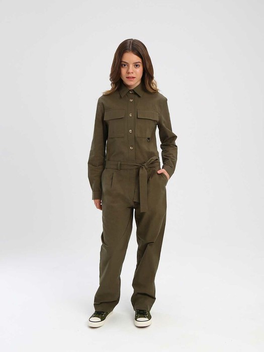 Комбинезон в стиле милитари — отличный вариант для тёплой весны и прохладного лета. Удобное лекало и свободный крой не сковывают движений. Натуральная ткань позволяет коже ребёнка дышать, отводит тепло и влагу от тела, создавая комфортный микроклимат. Комбинезон на пуговицах и с воротником-стойкой регулируется на талии, благодаря чему его можно приталивать или носить свободным.