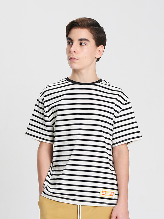 Стильная футболка для мальчиков. Свободный прямой силуэт и приспущенное плечо. Модель выполнена из качественного трикотажа, который отводит влагу и подходит для активного отдыха. Футболка выполнена в актуальную черно-белую полоску, что позволяет вписать ее в любой гардероб.