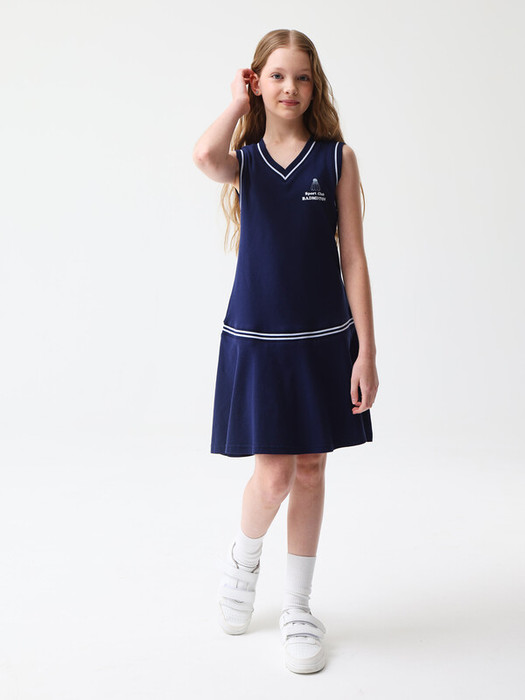 Короткое платье в теннисном стиле. Мягкий хлопковый трикотаж пике. Трапециевидный крой с отрезной талией и расклешенной юбкой. V-образный вырез. Декоративная полоска на воротнике, в проймах и по линии талии. На груди контрастный принт воланчика и надписью SPORT CLUB BADMINTON (с англ. «спортивный клуб бадминтона»). Размерный ряд 128 – 176 см.