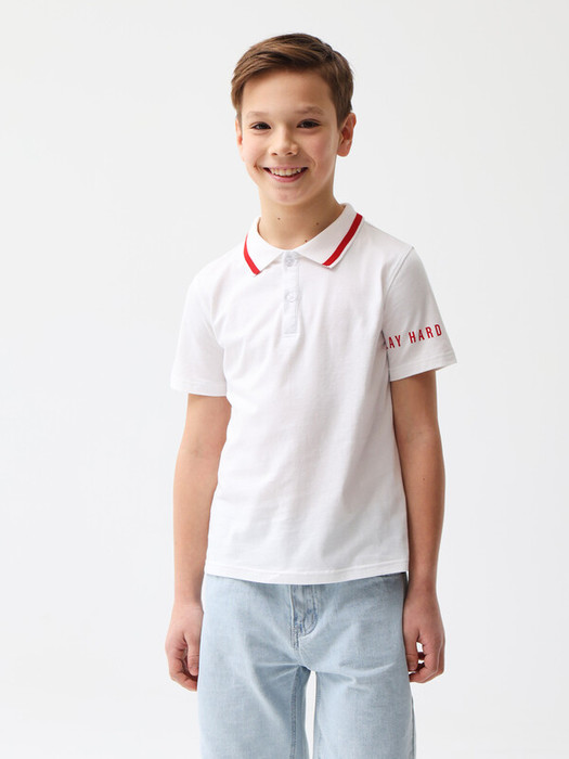 Трикотажное поло молочного цвета с короткими рукавами. Мягкий фактурный трикотаж из 100% хлопка. Классический прямой крой, отложной воротник, планка на двух пуговицах. На левом рукаве контрастный принт PLAY HARD/WIN EASY(с англ. «играй усердно/выигрывай легко»). Размерный ряд 128 – 176 см.
