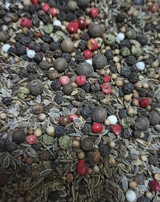Состав: семена укропа, перец черный, перец душистый, тмин, гвоздика, лавровый лист, кориандр, перец белый, перец розовый, перец зеленый.Восхитительный состав пряностей не оставит равнодушным никого. Перед применением перетереть нужное количество смеси в ступке для специй или перемолоть в мельнице. Так Вы получите непередаваемый аромат, который дополнит любое блюдо.