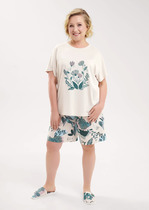 Женская сорочка выполнена из вискозного полотна с набивным рисунком. Горловина оформлена бейкой из основного полотна. Низ рукавов и изделия обметаны декоративным стежком "пике".