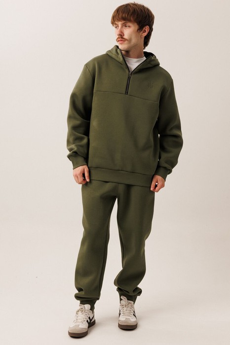 Этот спортивный костюм от GOwear отлично подойдет для дома, прогулок, путешествий и отдыха. Сделан из теплой, комфортной ткани. Состоит из джемпера и брюк. Джемпер имеет двойной капюшон и короткую застежку - молнию черного контрастного цвета по центру переда. На переде с левой стороны выполнена вышивка в цвет ткани, а также расположена горизонтальная кокетка. Джемпер имеет прямой силуэт. Низ джемпера и манжеты выполнены из кашкорсе. Брюки зауженные к низу с притачным поясом (резинка и шнурок внутри). Брюки с боковыми карманами. По низу брюк – манжеты.