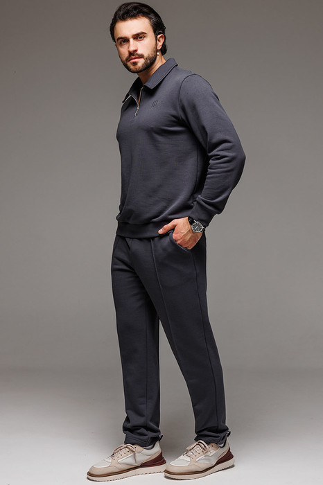 Для образа игрока в гольф не хватает воротничка! Воротник - деталь свитшота с застежкой поло, которая почекнет весь аутфит. Брюки со стрелками добавят образу строгости и деловитости, что позволит носить костюм как на прогулки, так и в офис. Пошит из комфортной ткани - футера 3-нитки без начеса.