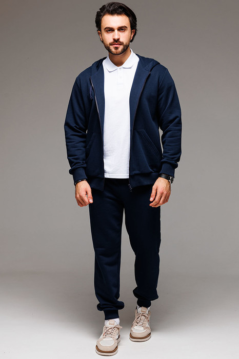 Классический мужской спортивный костюм состоит из худи на застёжке-молнии и брюк на манжетах. Всесезонная ткань сделает его любимым в Вашем гардеробе как для дома, так и улицы.