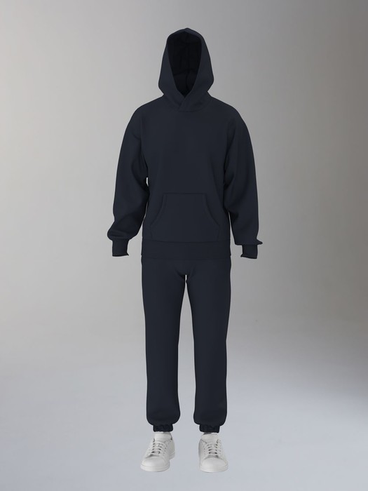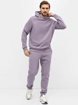 Мужской спортивный костюм из плотного трикотажа с петельной изнанкой. Верх комплекта - толстовка-худи с капюшоном, с накладным карманом "кенгуру". Рукава толстовки втачные, свободные со спущенной линией плеча, с эластичными манжетами. Брюки книзу заужены на резинку. Карманы брюк в боковых подрезах. Пояс брюк по линии талии дополнительно регулируется шнуром.