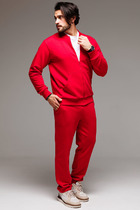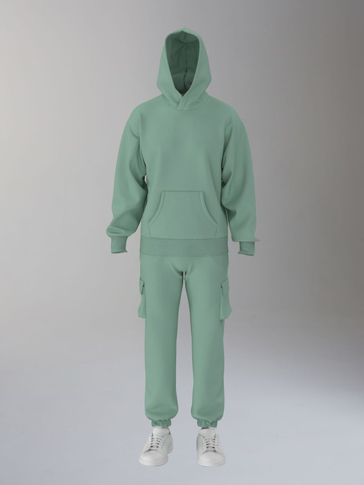 Мужской спортивный костюм из плотного трикотажа с петельной изнанкой. Верх комплекта - толстовка-худи с капюшоном, с накладным карманом "кенгуру". Рукава толстовки втачные, свободные со спущенной линией плеча, с эластичными манжетами. На тактических брюках "Карго" два объемных накладных кармана с клапанамии и еще два кармана в боковых подрезах. Брюки зауженны книзу на резинку. Пояс брюк на резинке, по линии талии дополнительно регулируется шнуром.