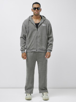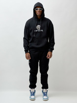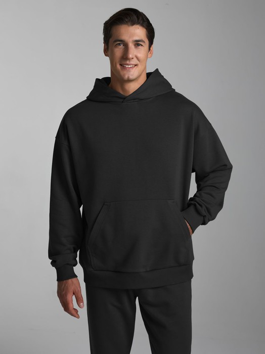 Мужской спортивный костюм из плотного трикотажа с петельной изнанкой. Верх комплекта - толстовка-худи с капюшоном, с накладным карманом "кенгуру". Рукава толстовки втачные, свободные со спущенной линией плеча, с эластичными манжетами. Брюки книзу заужены на резинку. Карманы брюк в боковых подрезах. Пояс брюк по линии талии дополнительно регулируется шнуром.