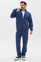 Спортивный костюм из эластичного хлопкового трикотажного полотна. Куртка на молнии с воротником-стойкой. Карманы на куртке и брюках прорезные с листочками на молнии. Посадку по фигуре обеспечивает эластичное трикотажное полотно с полосами по воротнику, поясу и манжетам. Брюки прямые. Эластичный пояс брюк по линии талии дополнительно регулируется шнуром. На левой полочке вышивка "герб СССР" шелковыми нитями, на брюках вышивка СССР. На спинке аппликация "СССР".