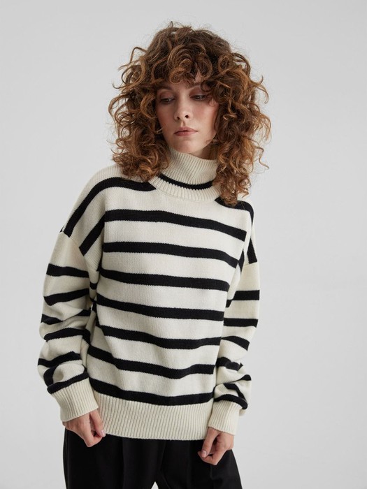 Свитер свободного кроя со спущенным плечом в полоску, принт выполнен в технике вязания жаккард, воротник-стойка, резинка на рукавах и по низу изделия.