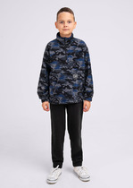 Свитшот прямого силуэта с втачными длинными рукавами, по линии низа имитация текстильной рубашки. Изделие выполнено из полотен контрастного цвета и разной текстуры, на полочке есть принт. Горловина круглая и обработана притачной бейкой. В качестве дополни