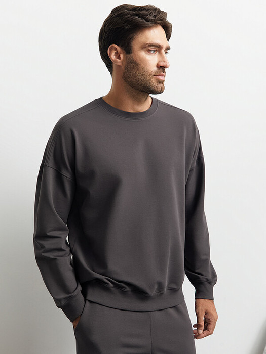 Мужской свитшот свободного кроя из двухниточного футера со спущенным плечом, длинными рукавами и круглым вырезом. Манжеты, горловина и низ, оформленные рибаной в лаконичный рубчик, добавляют текстурности и делают силуэт более графичным.
