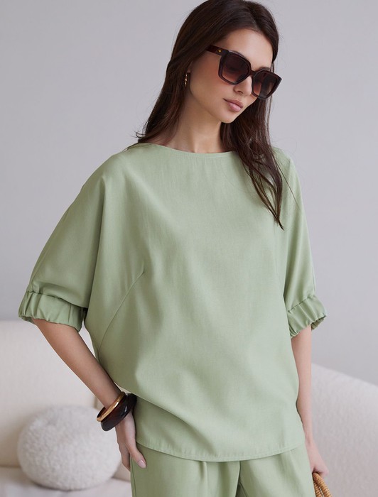 Состав: 76%Лиоцелл (Вис) 24%ПЭСвободная блузка светло-зеленого цвета выполнена из плотного лиоцелла. Лиоцелл это более дорогой и экологичный вариант вискозы, очень прочный и шелковистый. Современная интерпретация кроя «летучая мышь» дополнена акцентными эластичными манжетами. Эта блузка идеальна для любого типа фигуры, в том числе и на королевские размеры. Этот крой создан для того, чтобы мягко скрыть лишние объемы. Эта повседневная блузка с вырезом лодочка создана для легкого и утонченного стиля. Мягкие линии кроя создают невероятно эффектный образ, который подчеркивает естественную красоту, не стесняя движений, а свободный фасон дарит ощущение абсолютного комфорта и уверенности. Блузка красиво драпируется при движении, создавая летящий, воздушный эффект.