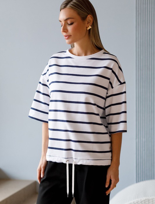 Состав: 75%Хлопок 20%ПЭ 5%ПУ Плотность: 200 Г/м2 Параметры модели на первом фото: Рост 170, бюст 89, талия 63, бедра 92Футболка свободного кроя выполнена из 100% хлопкового футера-двухнитки. По низу изделие дополнено регулируемым хлопковым шнуром. Мягкий хлопковый трикотаж гарантирует комфорт даже в жаркое время года. Сочетается в костюме с любыми брюками из футера или джинсами.