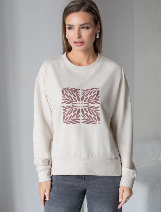 Состав: 95%Хлопок 5%ПУ Плотность: 240 Г/м2Стильный свитшот бежевого цвета с эффектом меланж из премиального футера двухнитки с эластаном сочетает в себе комфорт и оригинальность. Джемпер выполнен из натурального хлопка, который обеспечивает мягкость и дышащие свойства ткани. Нежный материал дарит ощущение уюта в любое время года, а премиальное качество изготовления гарантирует долговечность и сохранение формы после множества стирок. Особенность изделия — спущенная линия плеча и аккуратные разрезы, которые добавляют современный акцент и делают образ более выразительным. Принт в виде листиков придает индивидуальность, позволяя выделиться без лишней вычурности. Дополнен металлическим логотипом бренда.