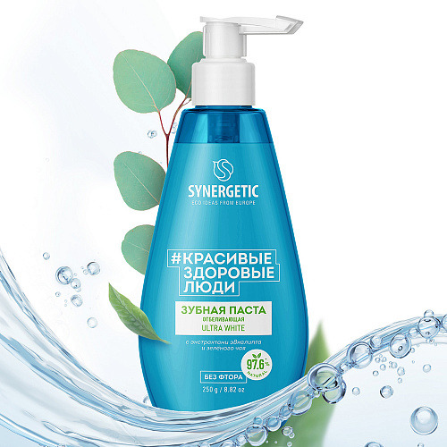 Зубная паста отбеливающая ULTRA WHITE — безопасная паста без фтора, которая эффективно очищает зубы и борется со скапливающимся на зубах налетом.